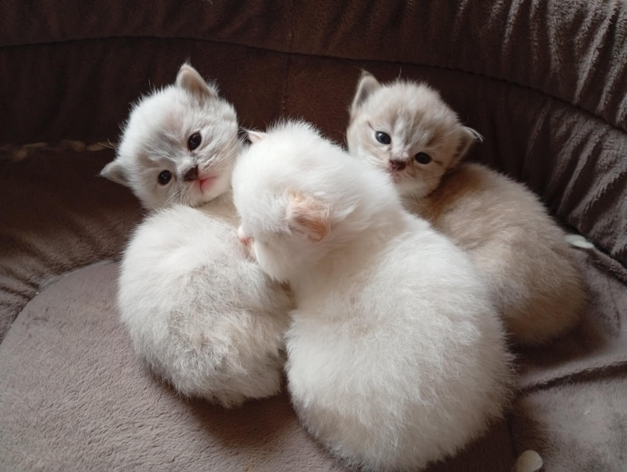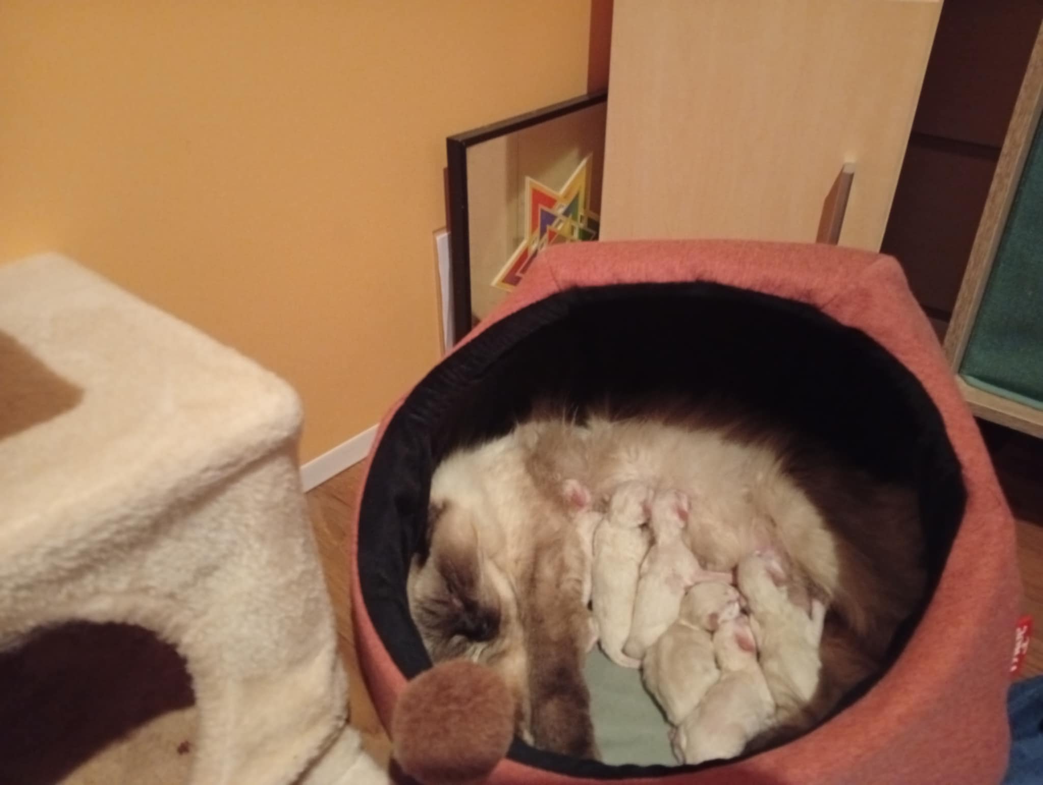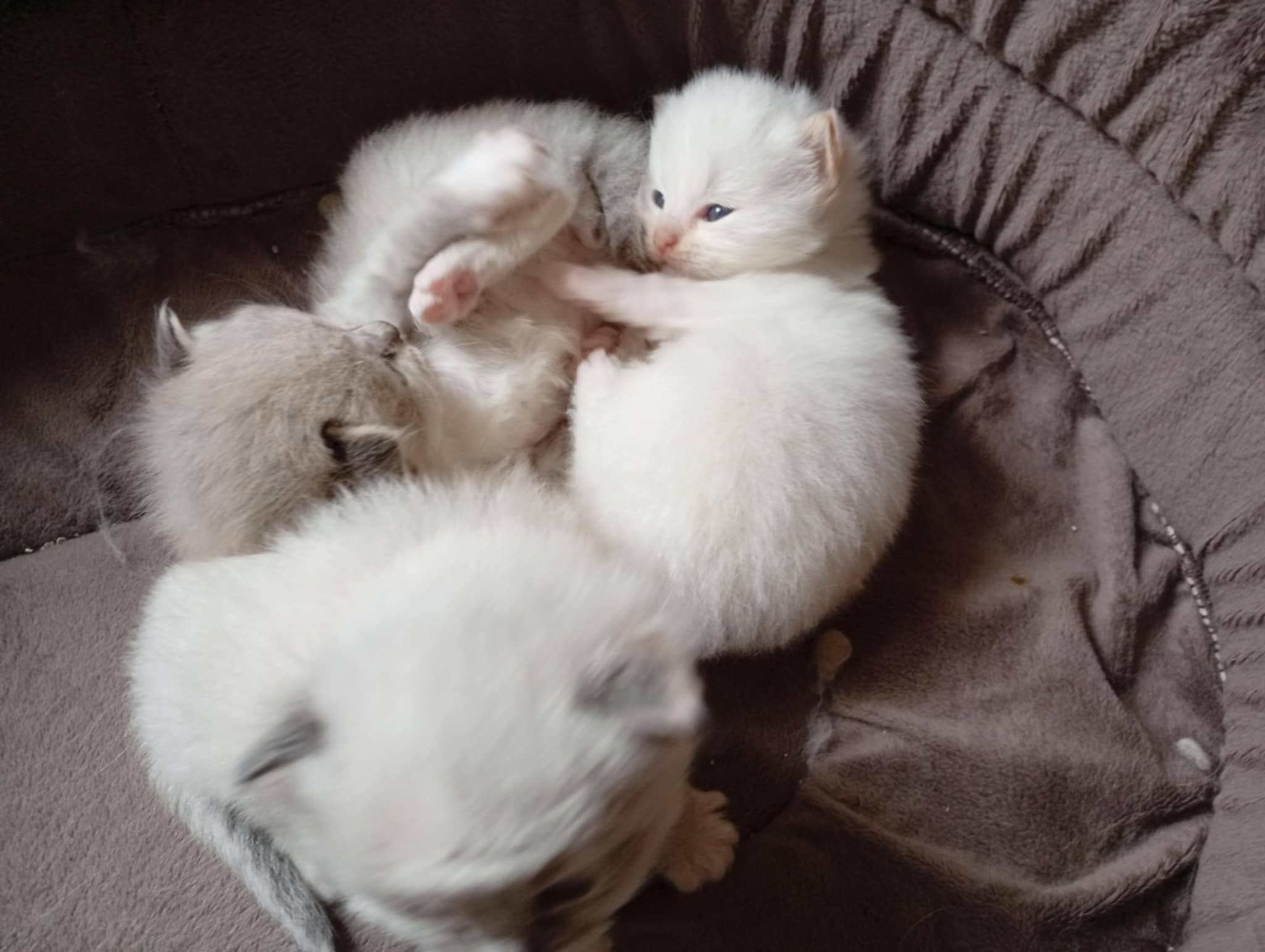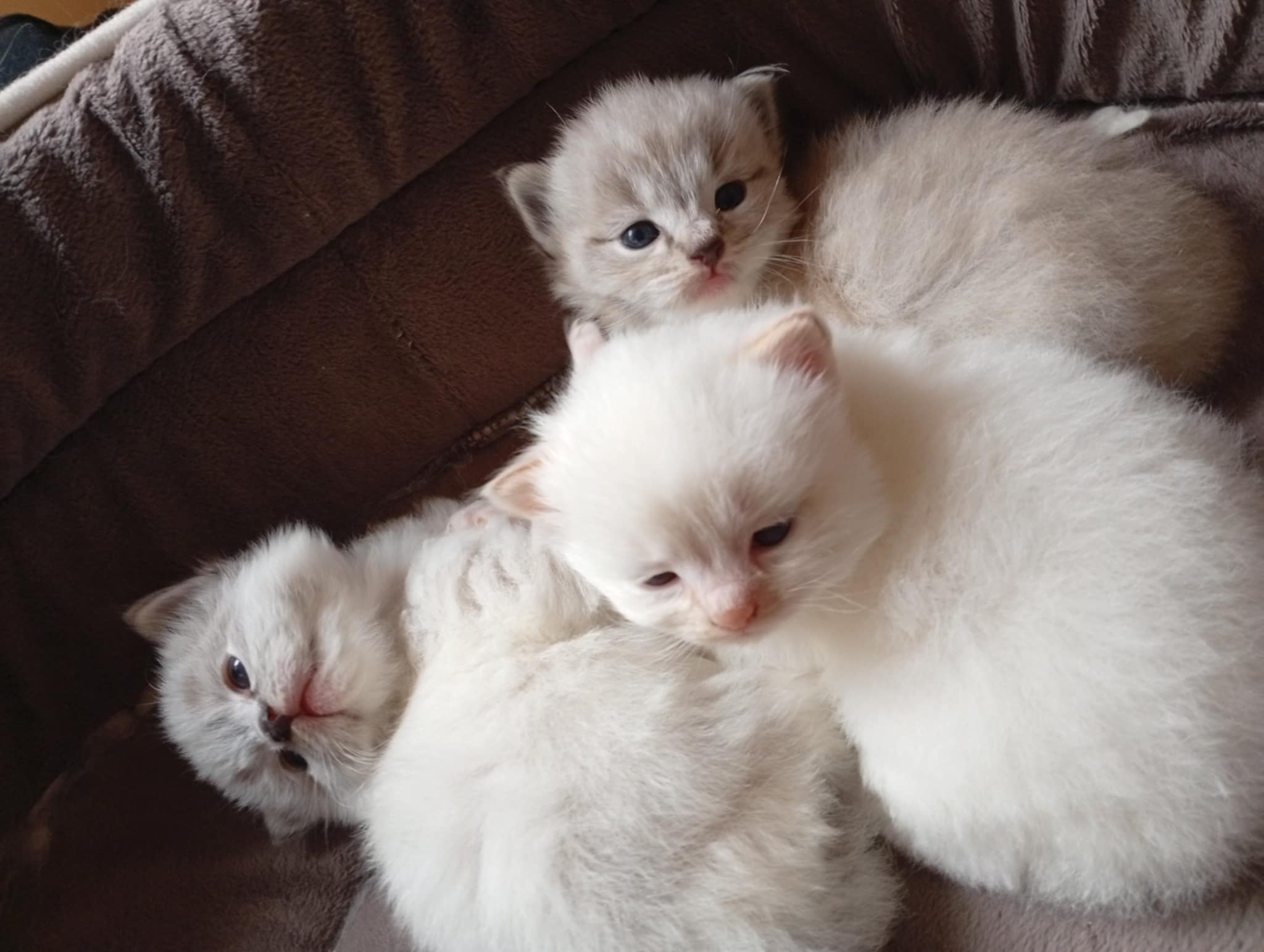 Tina des Reves d’Anais, Blue tortie mink et Uby du Pla’nana seal bicolor HM 3 petits chatons sont nés, 2 mâles et une femelle une blue tortie tabby mink mitted, un seal tabby mink mitted, un red tabby mink mitted les parents sont exceptionnellement doux et pacifistes