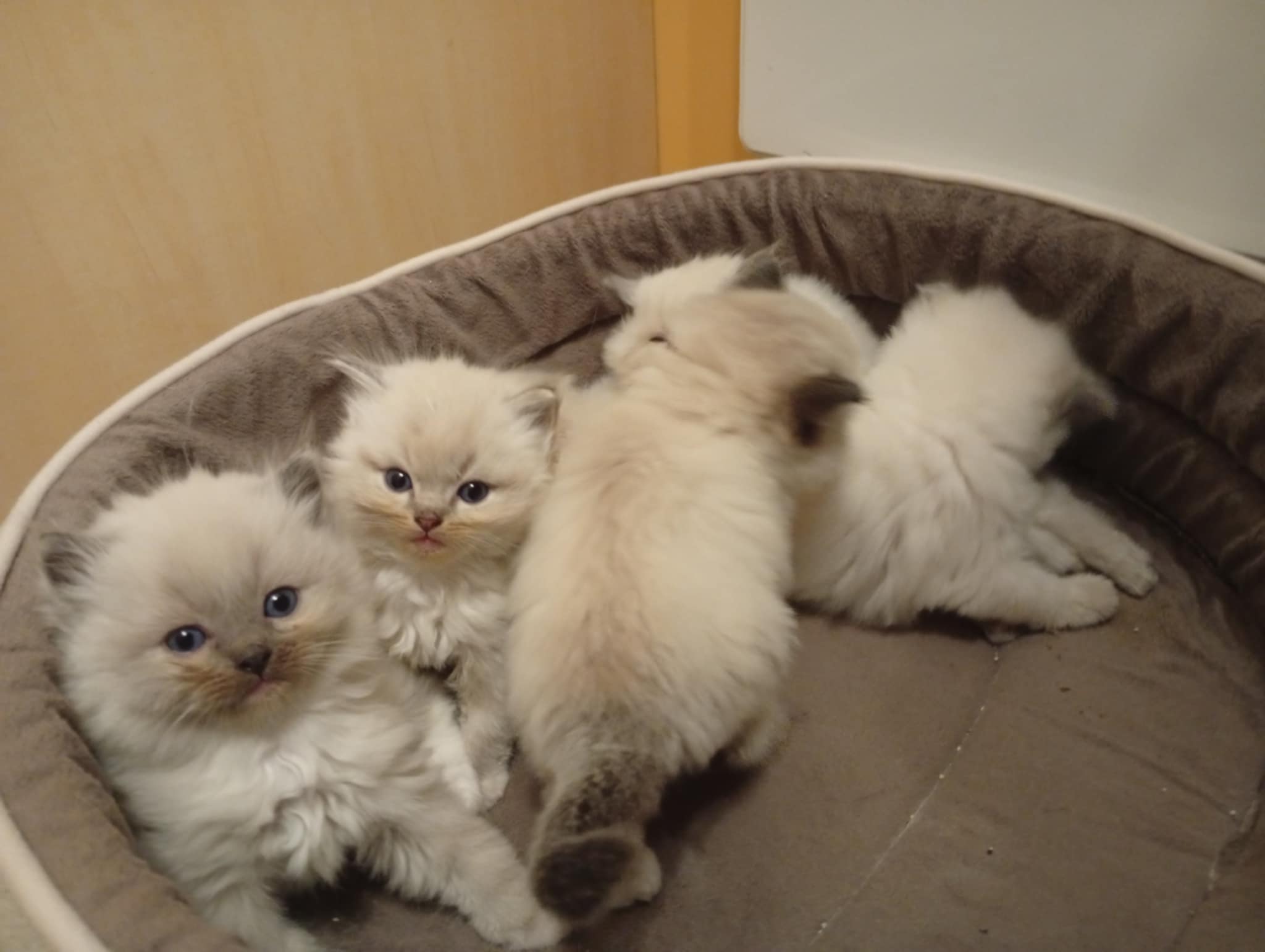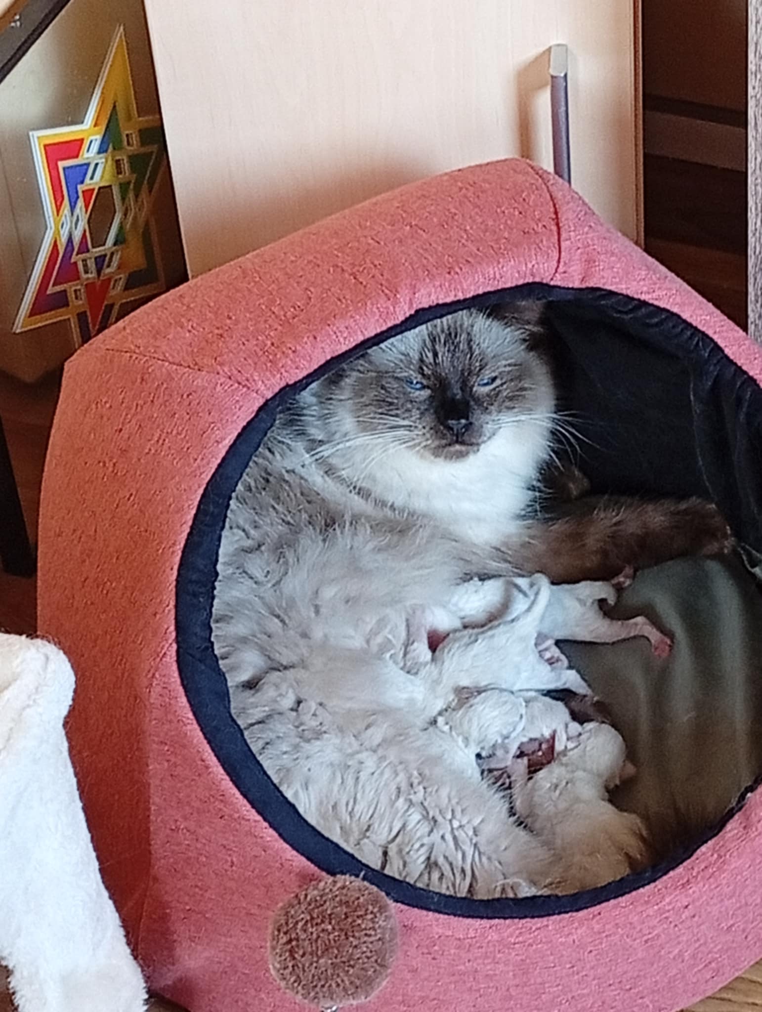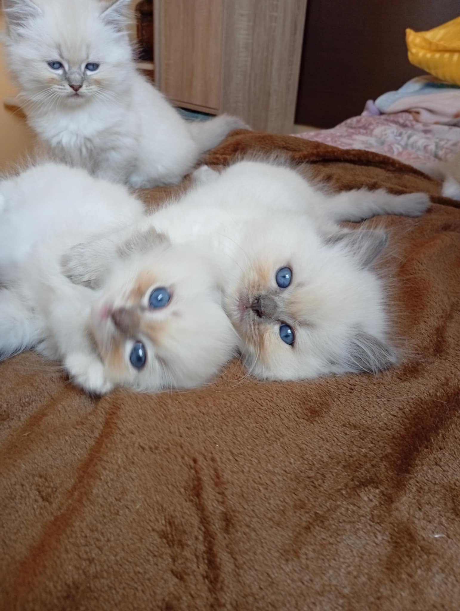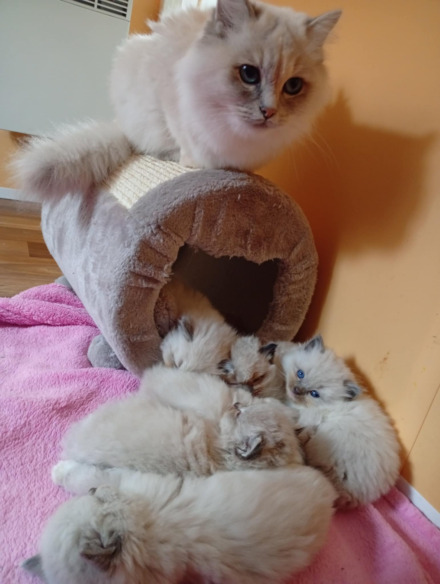 Tina des Reves d’Anais, Blue tortie mink et Uby du Pla’nana seal bicolor HM 3 petits chatons sont nés, 2 mâles et une femelle une blue tortie tabby mink mitted, un seal tabby mink mitted, un red tabby mink mitted les parents sont exceptionnellement doux et pacifistes